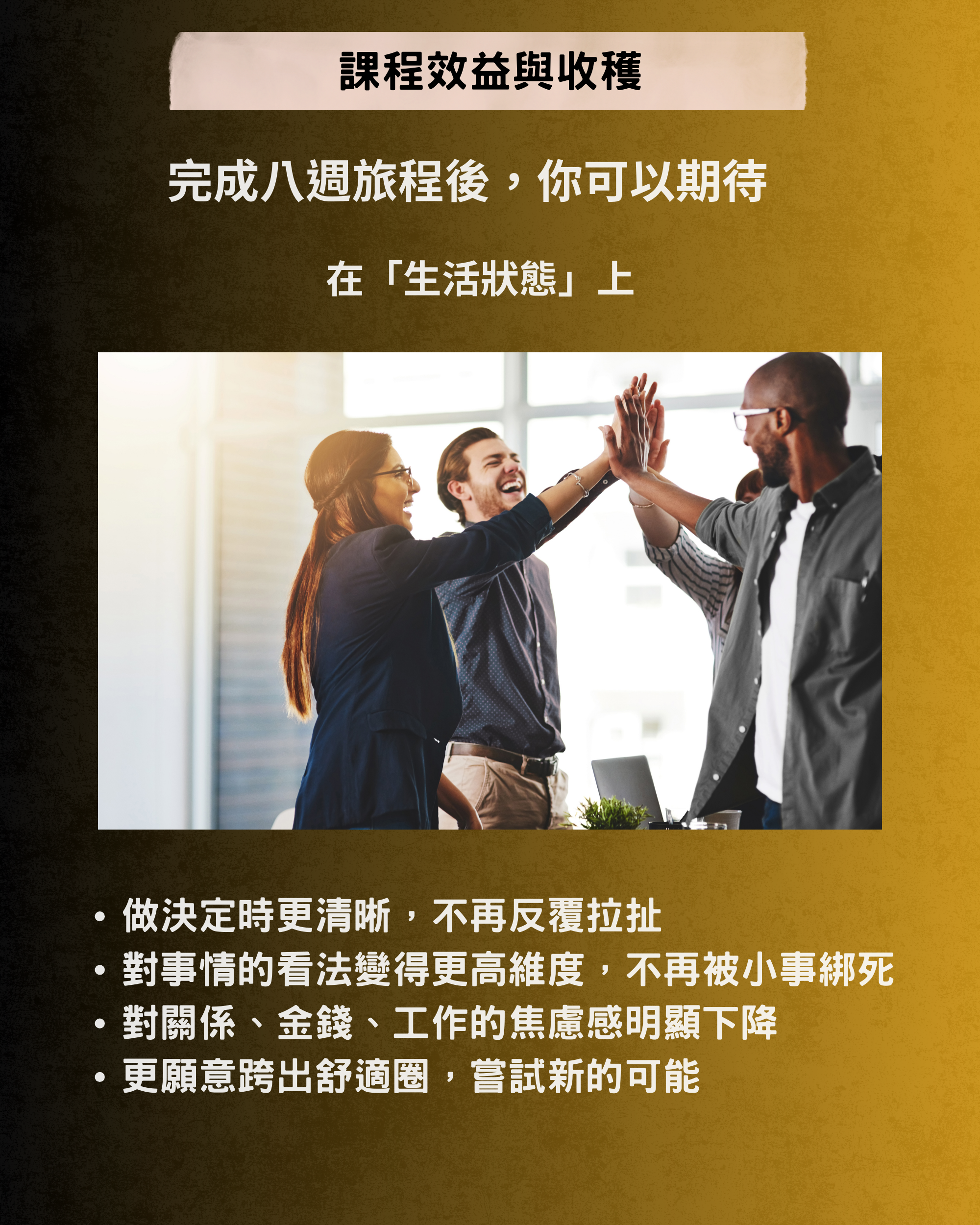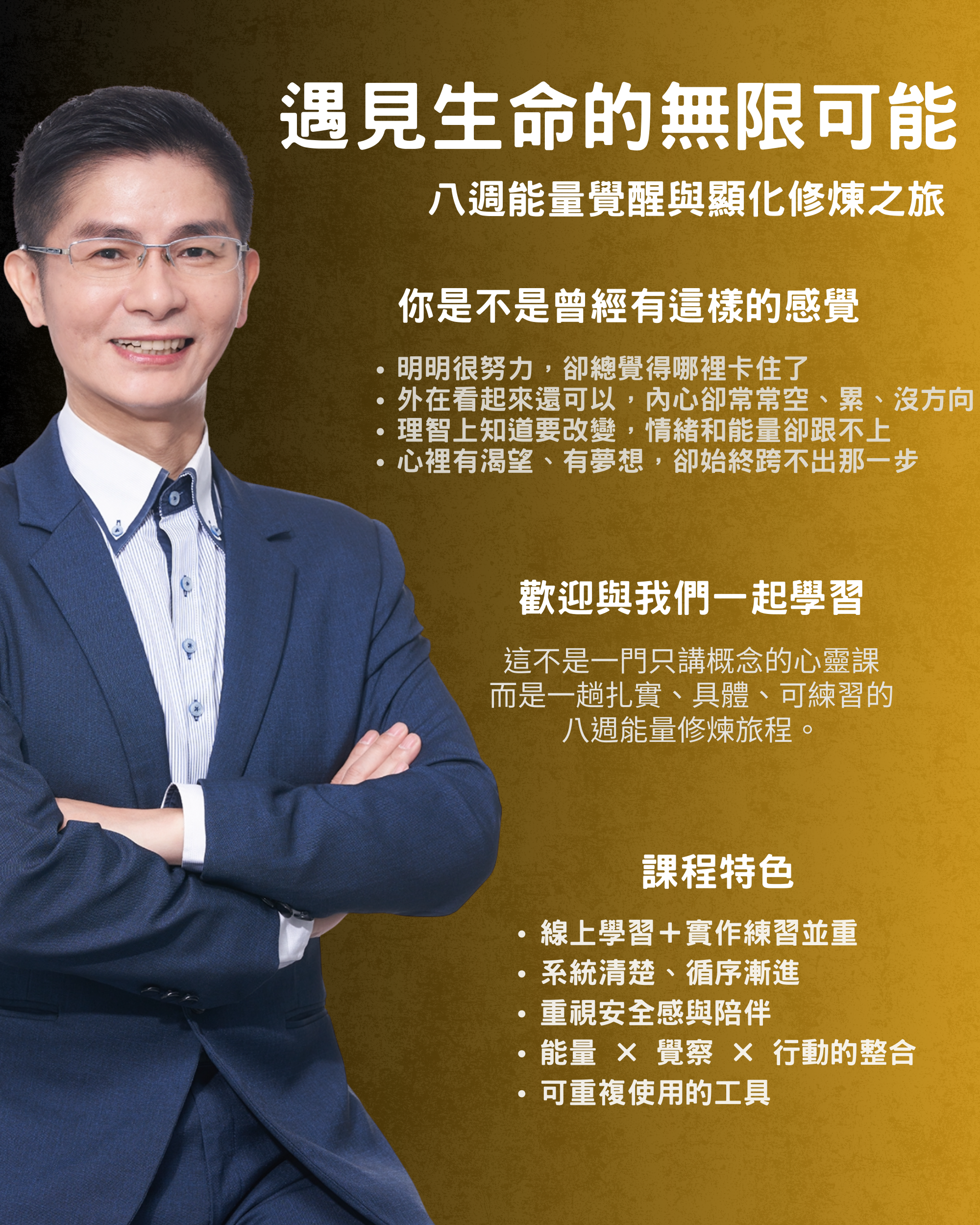 《遇見生命的無限可能》是一門為期八週的線上實作課程,透過能量調頻、覺察練習、情緒釋放與顯化法則,帶你重新整理內在、打開生命視野,找回力量、自信與方向。這門課會幫你從卡住、混亂與低能量中走出來,啟動你真正渴望的生活與可能性。