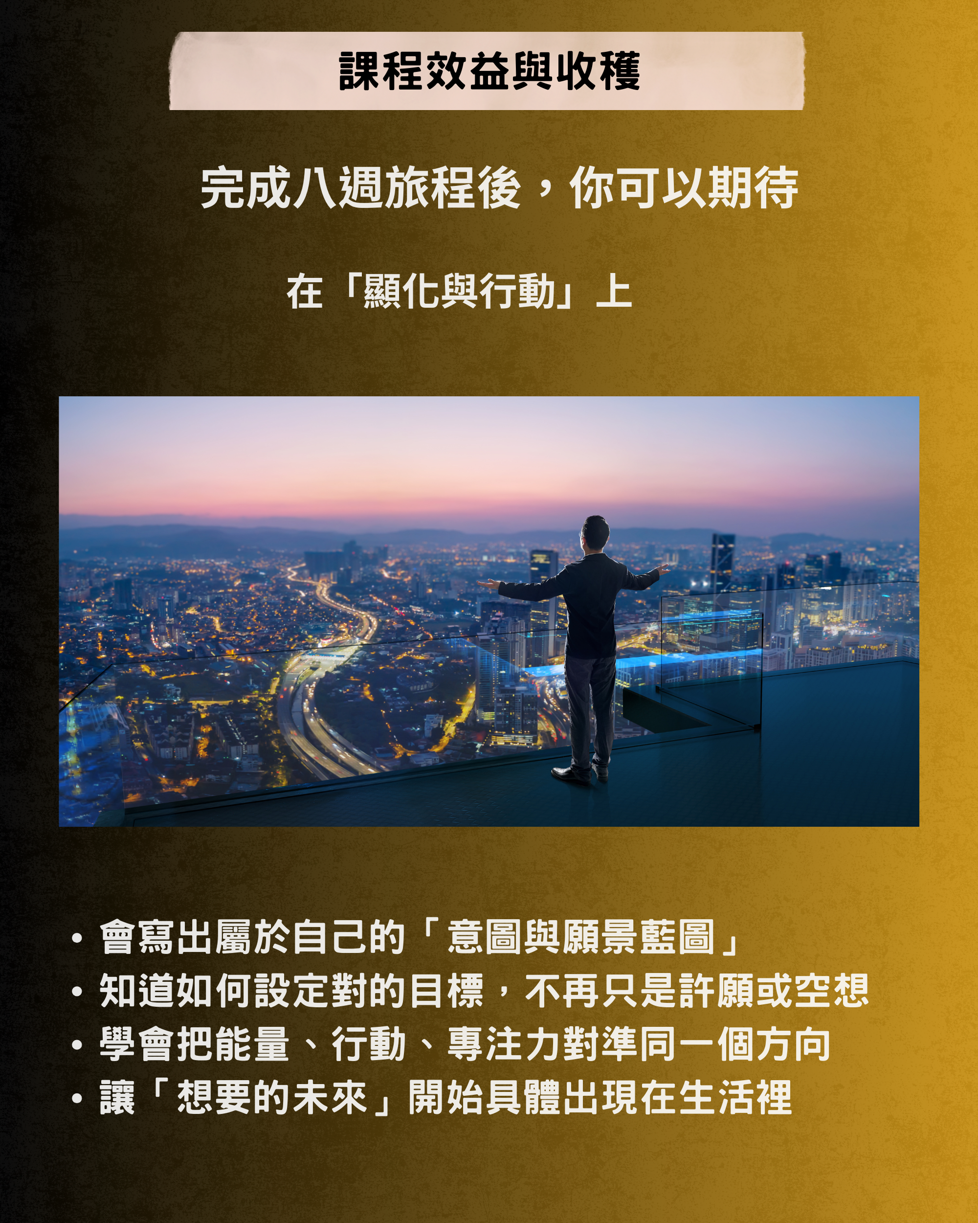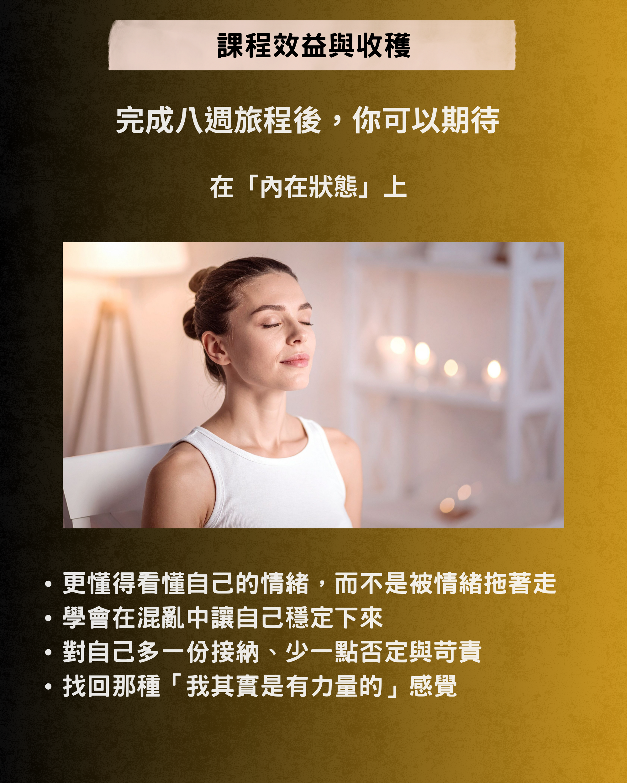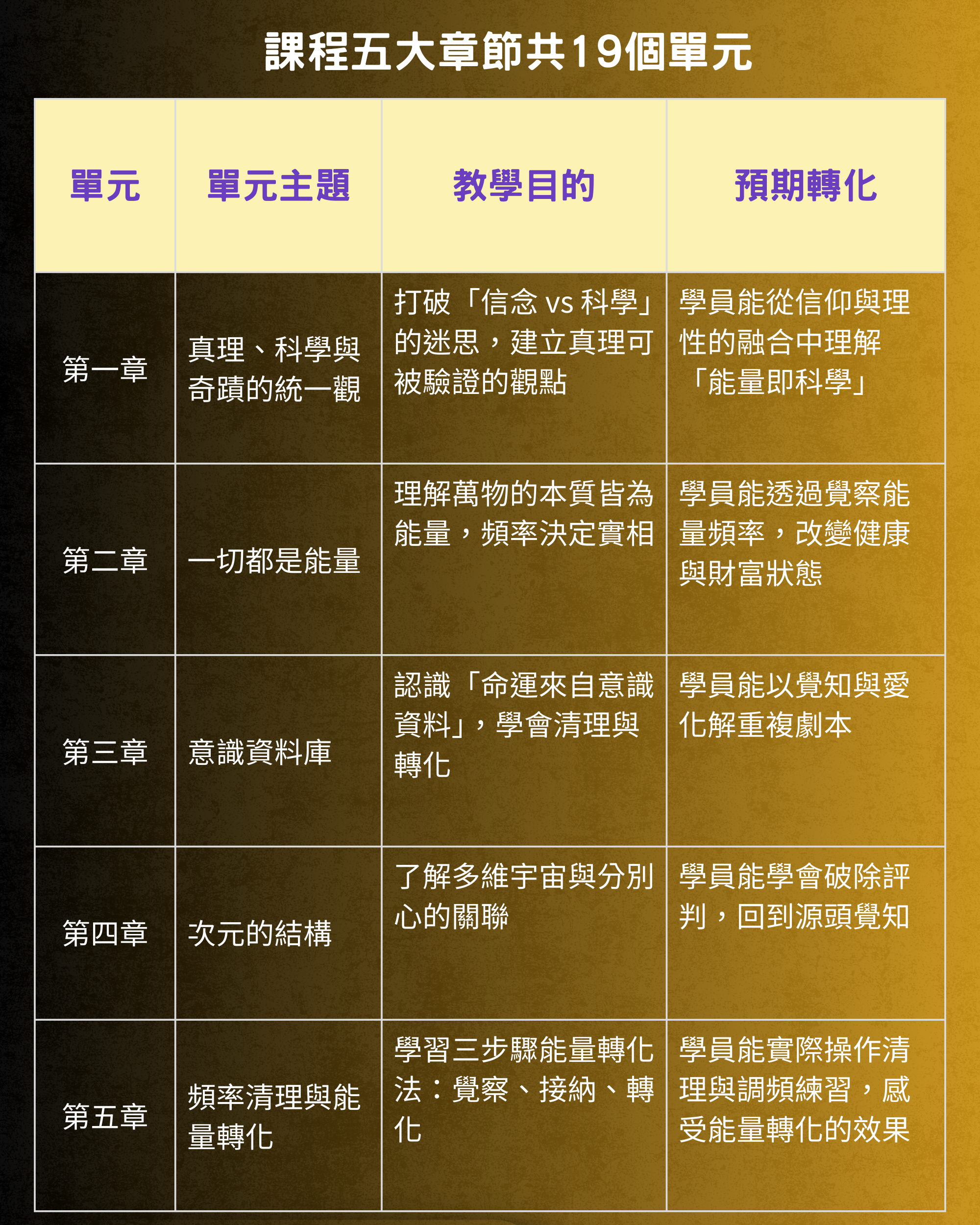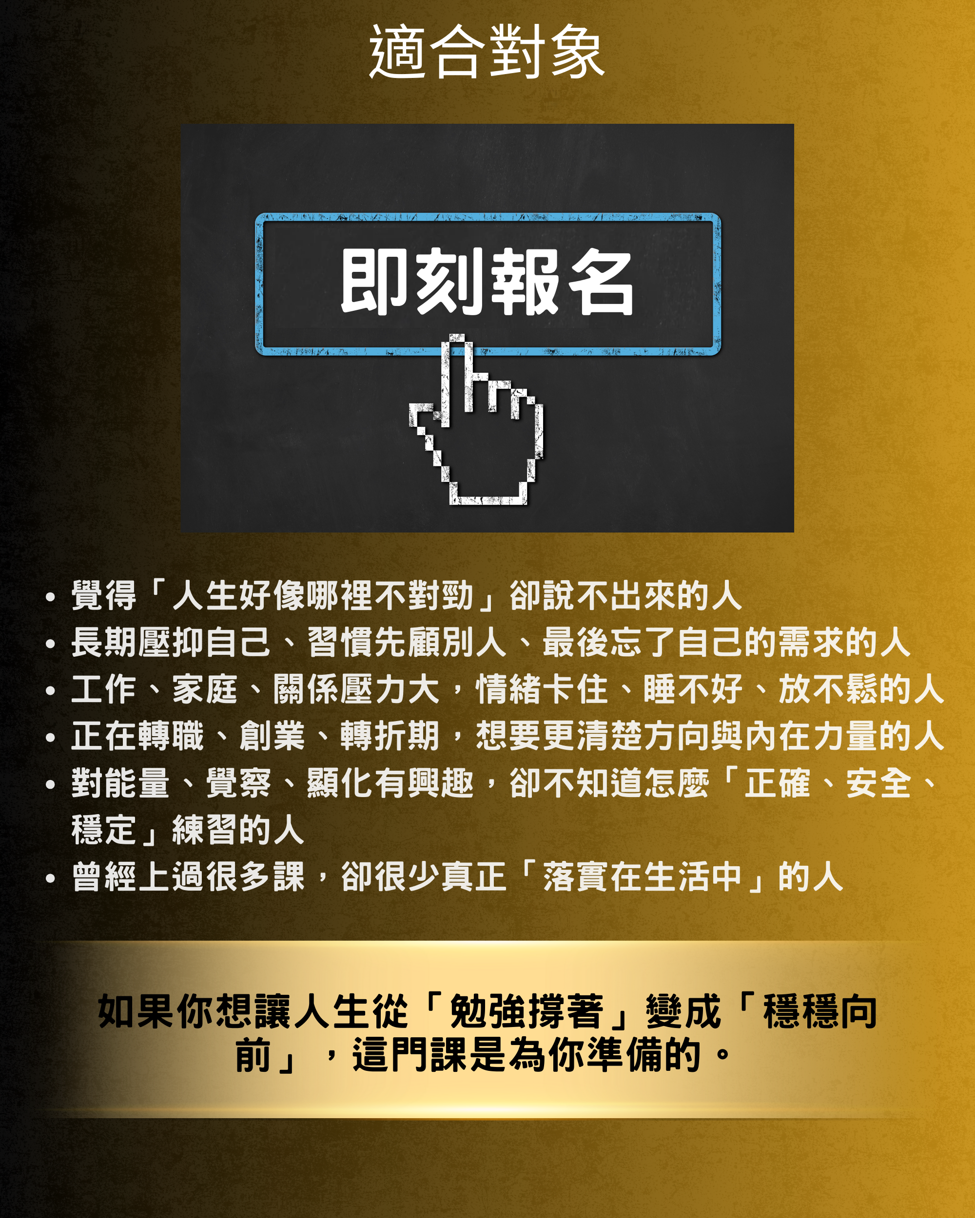 線上實作課程,透過能量調頻、覺察、情緒釋放與顯化法則,整理內在、打開生命視野,找回力量、自信與方向。