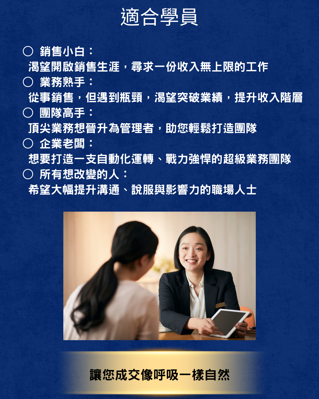 你的成交能力會被系統化、標準化、流程化。